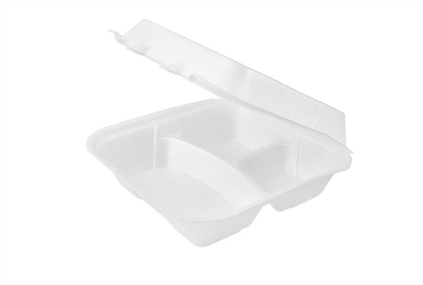 (CASE) 8"X 8 3-COMPARTMENT WHITE FOAM LUNCH BOX-HINGED-BAY-2 LOCK-REGULAR (2PK X 100PCS)-200CT (#122)